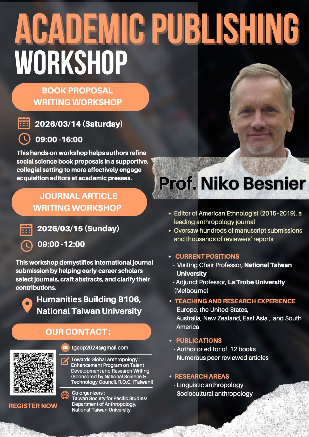 This two-day workshop series focuses on academic publishing, with sessions dedicated to two key forms of scholarly writing: book proposals and journal articles. The sessions will be facilitated by anthropologist Niko Besnier, former editor of American Ethnologist. Participants will gain practical guidance on developing, positioning, and submitting their work to international academic presses and journals. All sessions will be conducted in English.